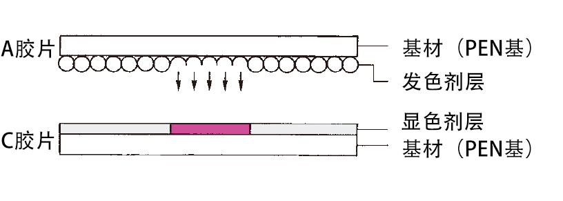 壓力測量膠片由兩片膠片組成:A膠片和C膠片。A膠片是一種涂有發(fā)色劑(微膠囊)的基材(PEN基)。C膠片是一種涂有顯色劑的基材(PEN基)。這種膠片的使用方法是將涂有化學制劑的兩面相互接觸。
