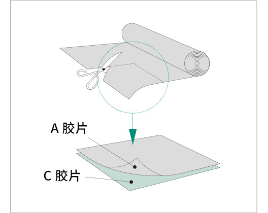 2.將A膠片的發(fā)色劑和C膠片的顯色劑放在一起,把裁剪好的膠片放入到要測量的地方,C膠片在下面,A膠片在上面。施加壓力。